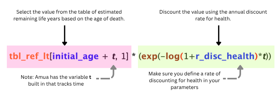To properly add YLLs with discounting from the time of death, we will use the following formula: