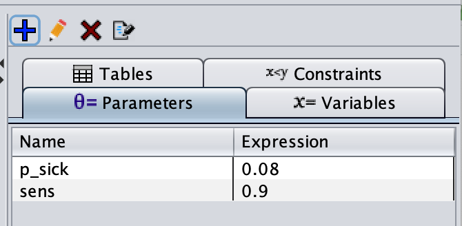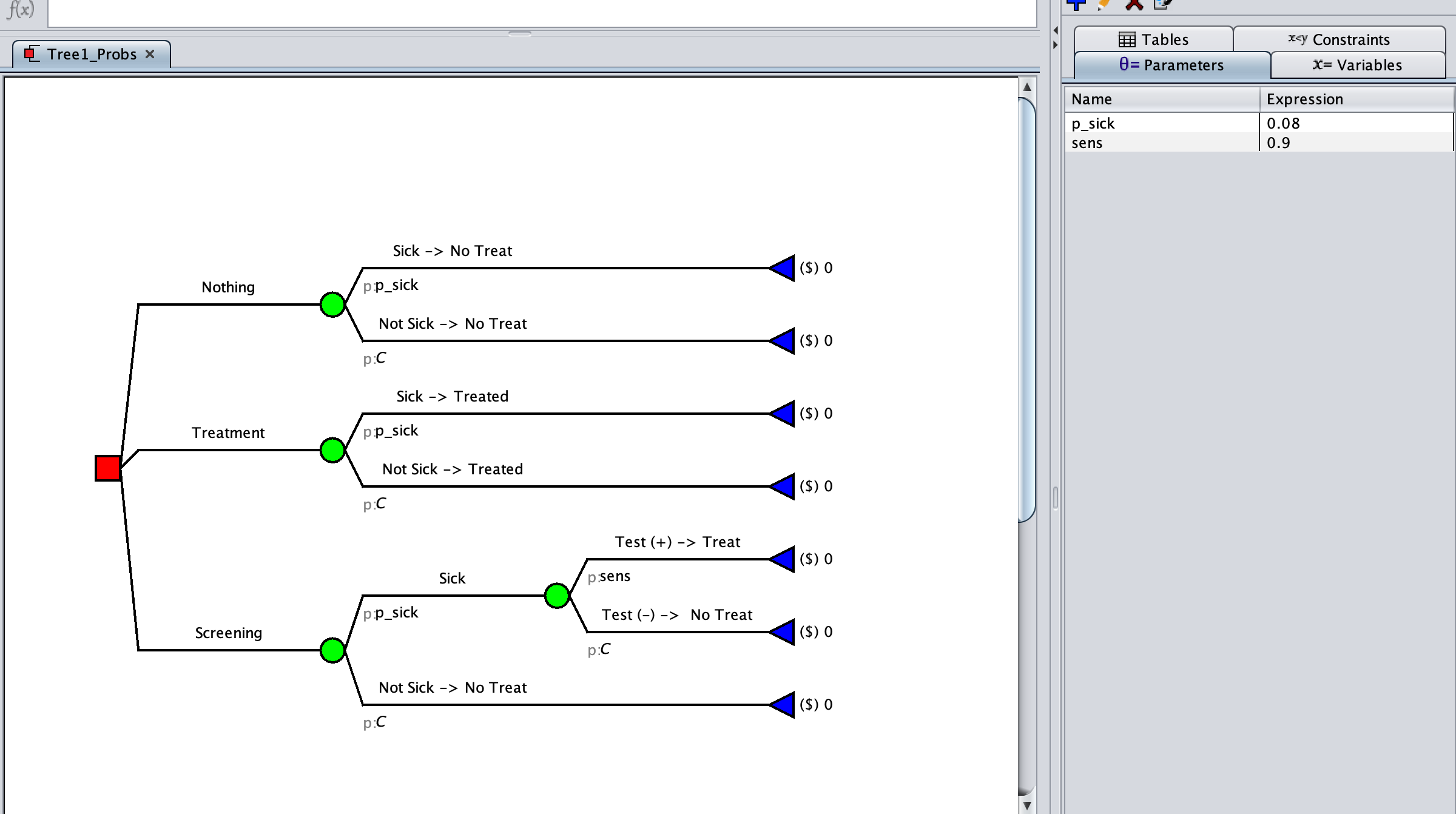 p_sick: which will go on any branch where someone gets sick sens: which will go on any branch where someone is sick AND tests positive