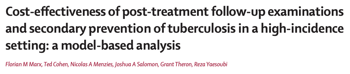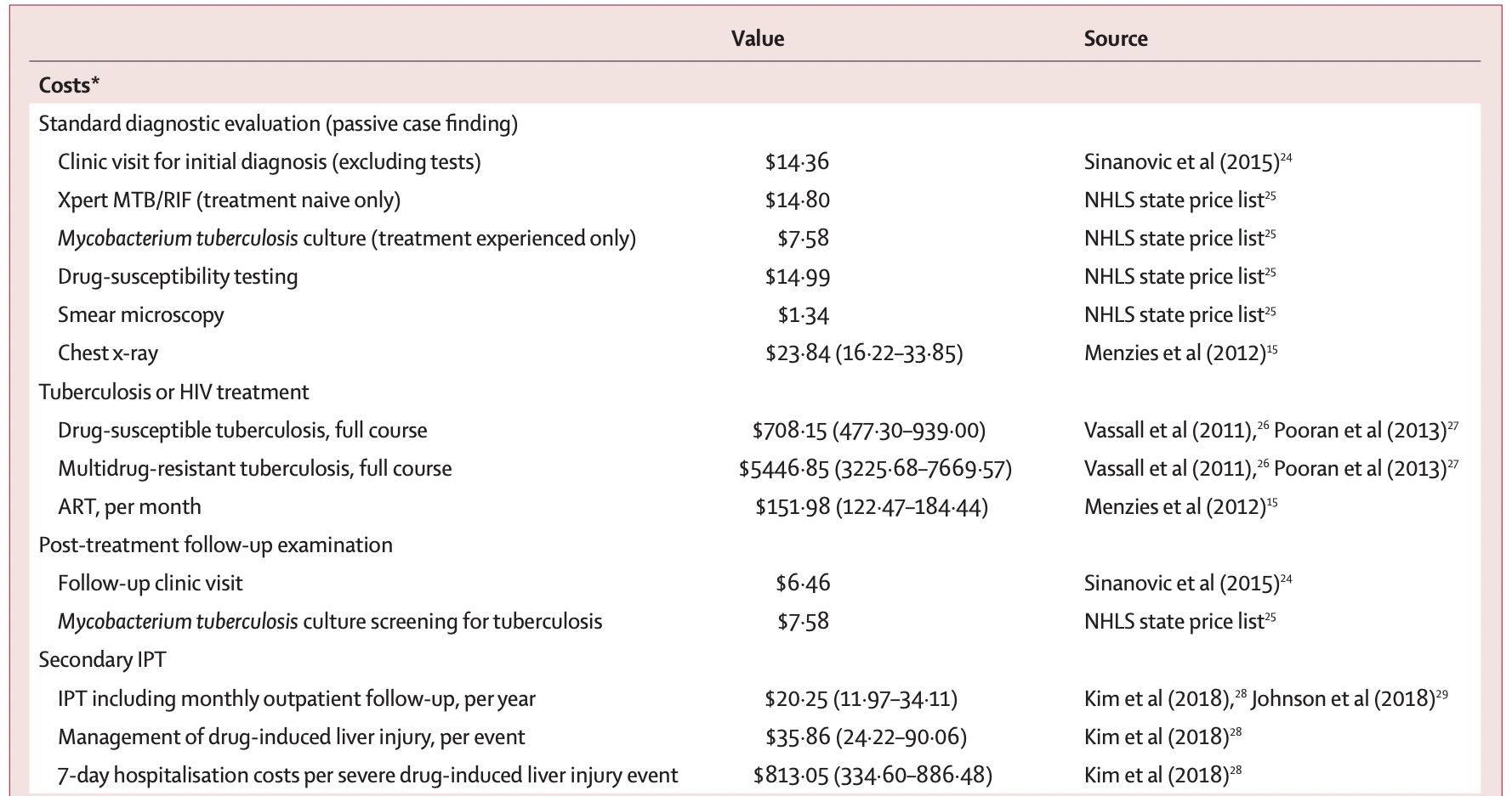 E.g., “TB healthcare & diagnostics are from official price list of the National Health Laboratory Service in South Africa; Costs for follow-up reflect local clinic and culture-based screening for active-tuberculosis”