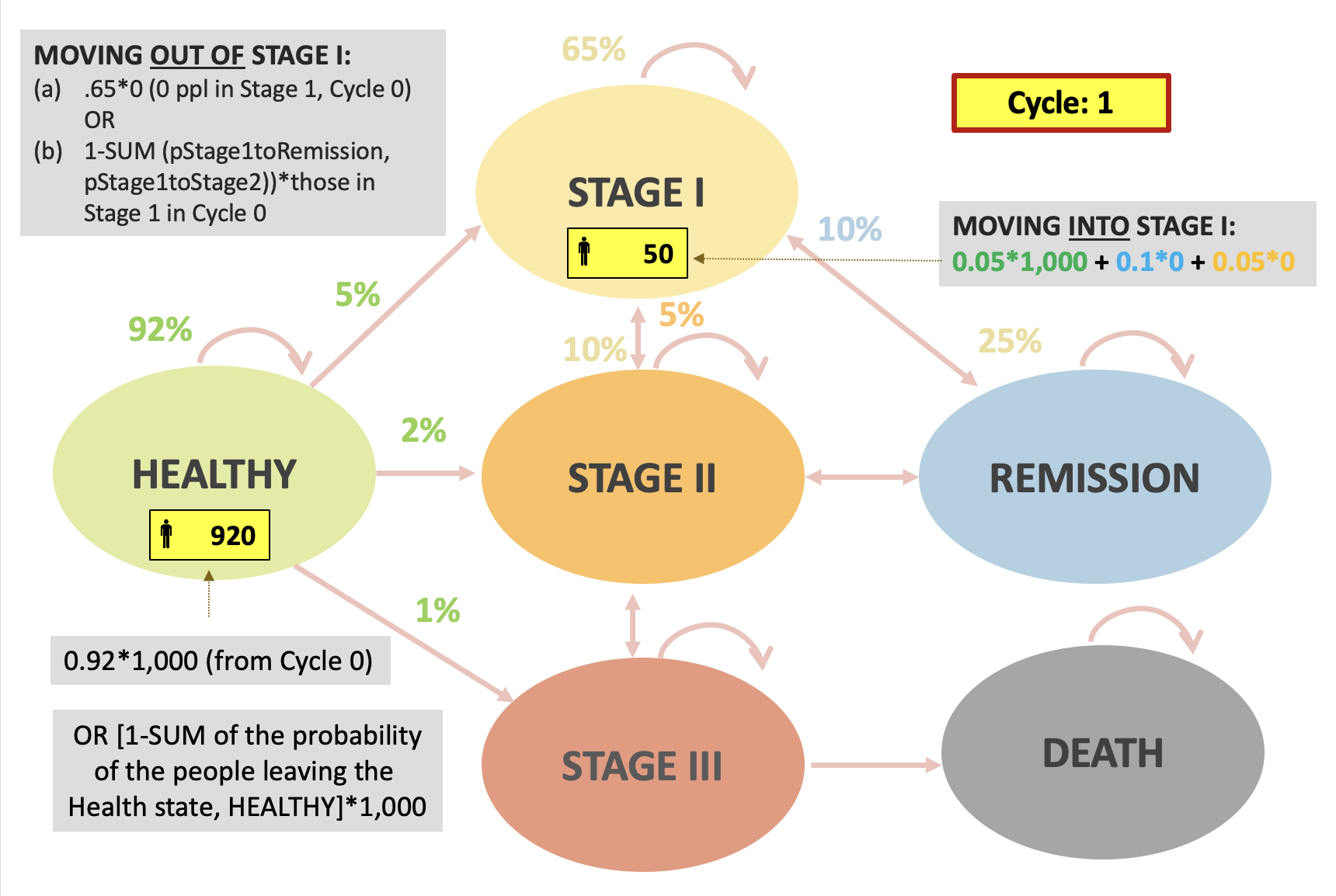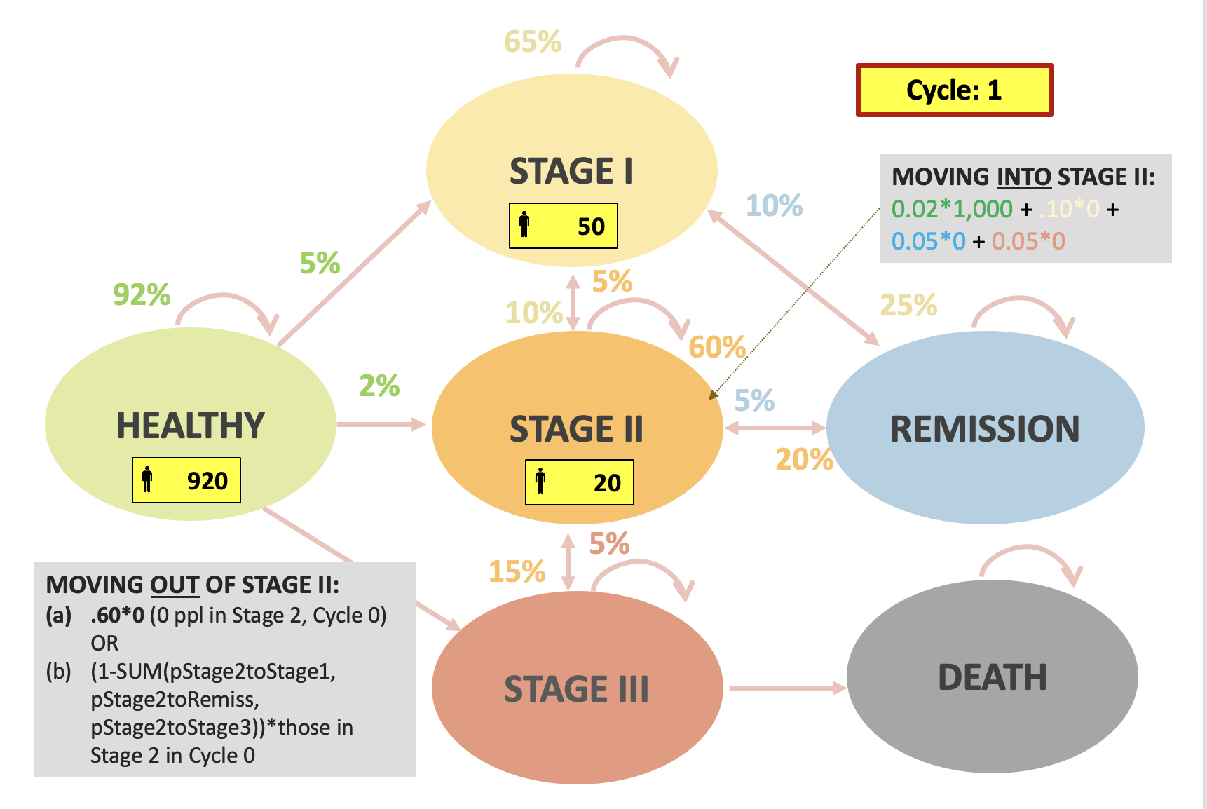 In real life, events could occur at any points in a given cycle, but a Markov model assumes all events occur either at the beginning or end of each cycle